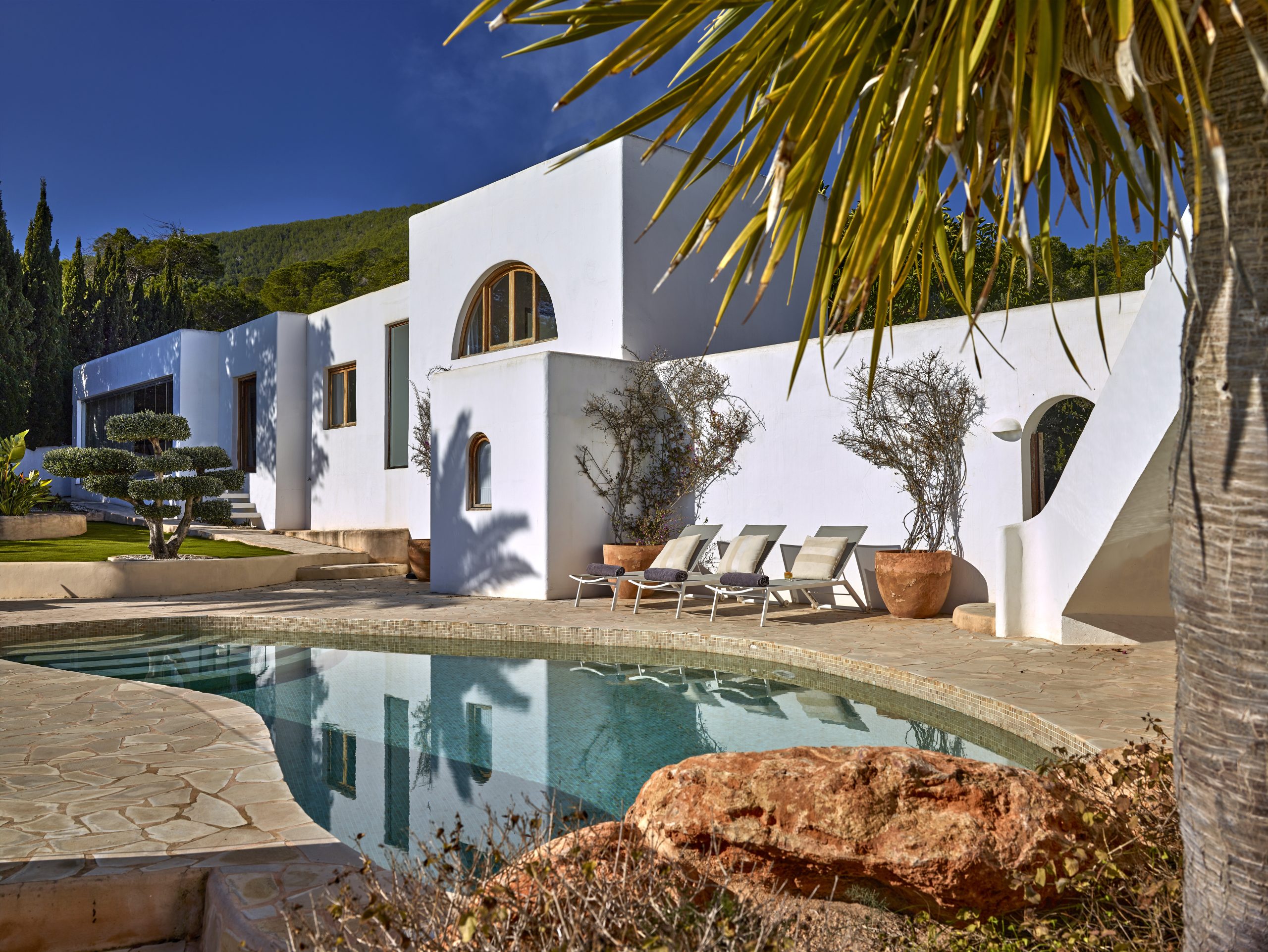 Villa Sol den Serra is quite simply a little piece of paradise. This majestic villa, perched high above the sea, offers unrivalled views of the sparkling crystalline waters of Sol den Serra bay. It combines traditional Ibizan architecture with modern comforts, making it the perfect home away from home in an absolutely stunning location.