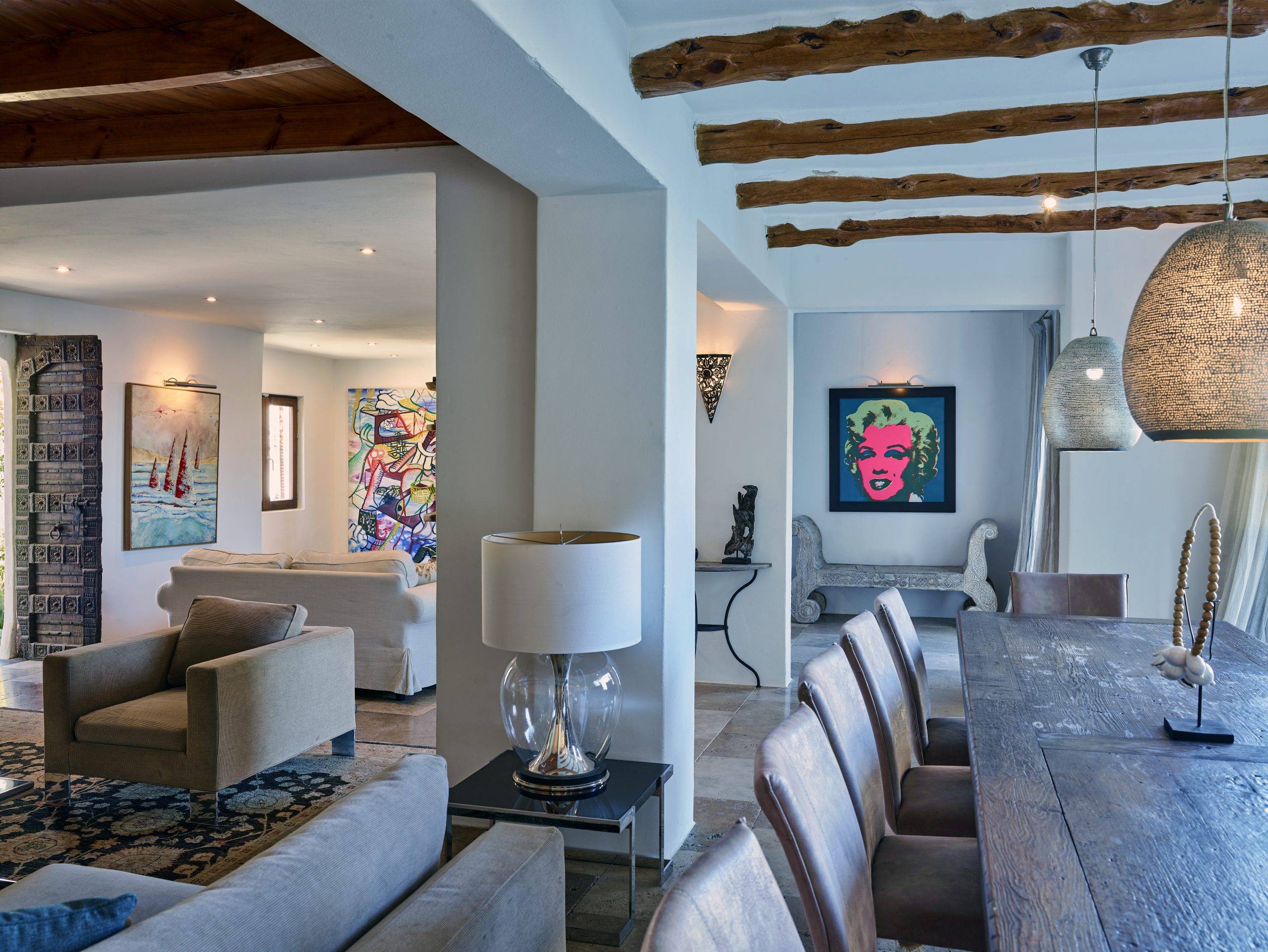 The décor features luxurious fittings, tasteful artwork, and antique wooden doors, all adding to the villa’s serene atmosphere.