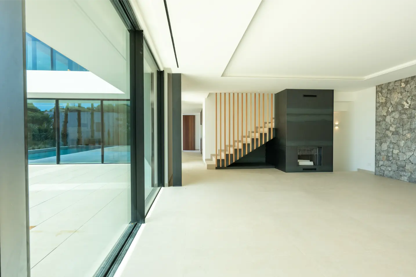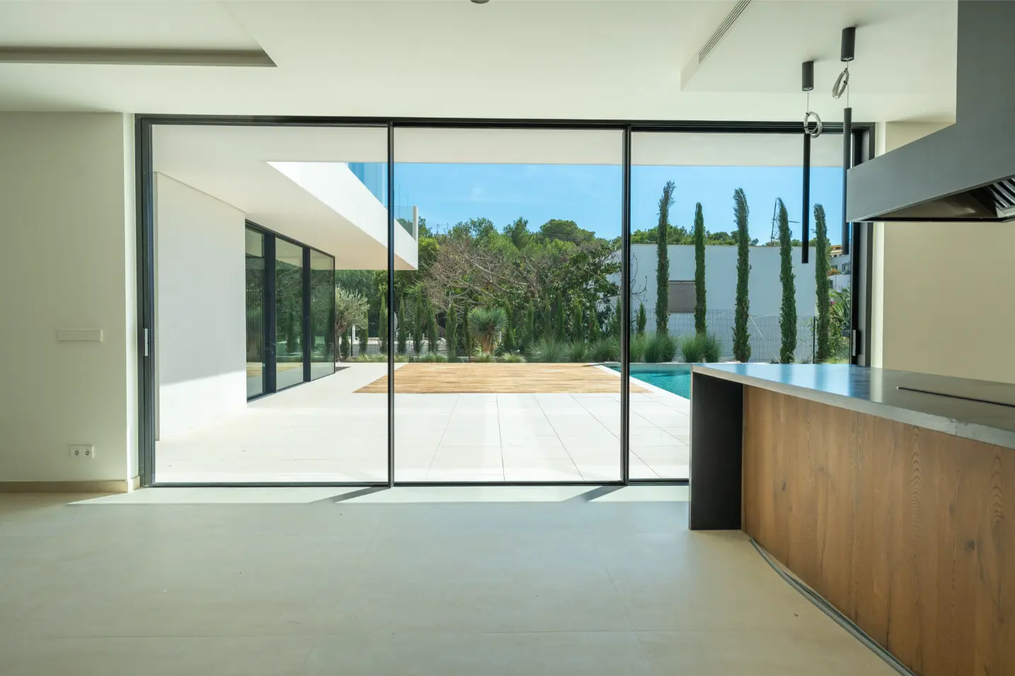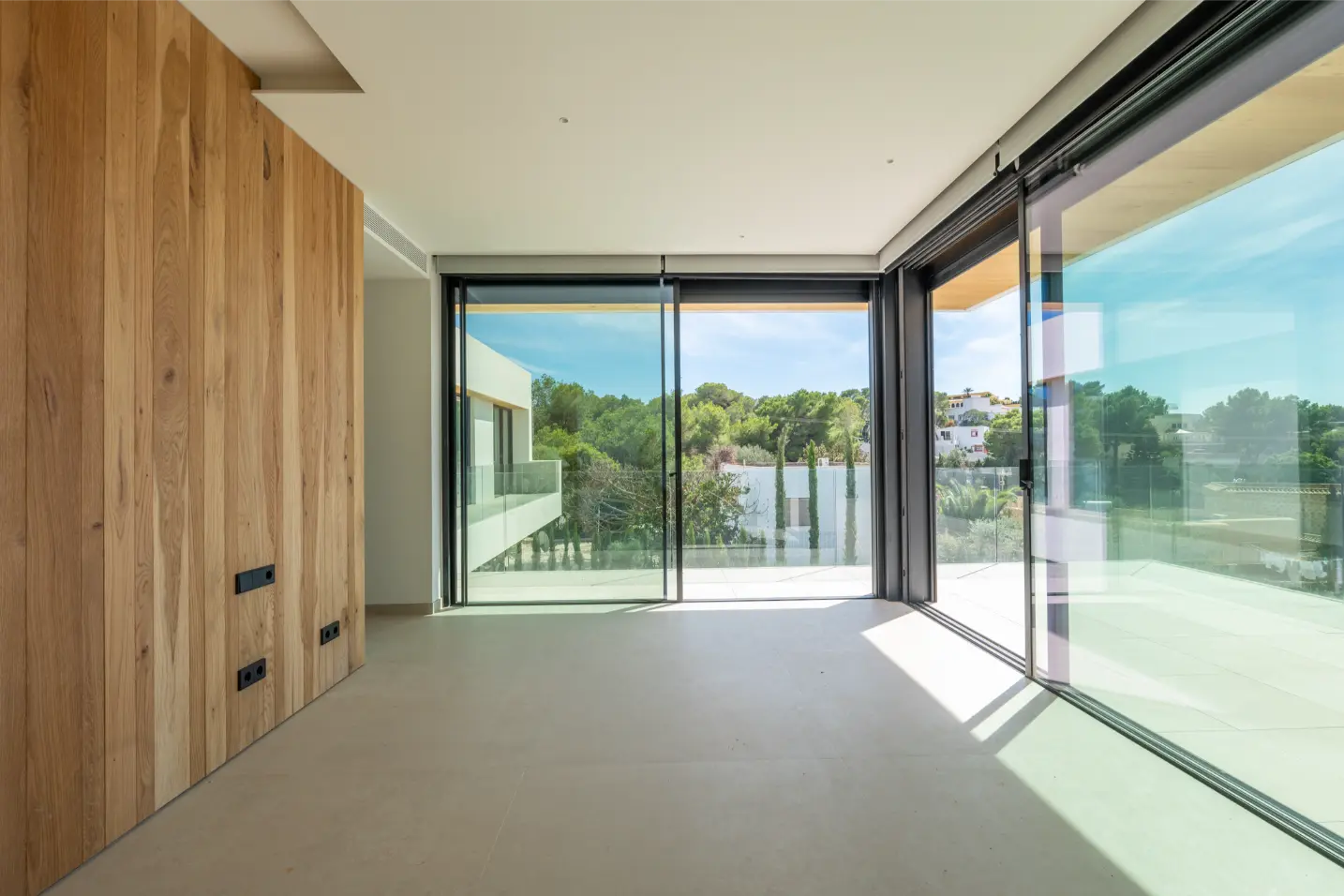 Designed for modern Ibiza living, this villa integrates indoor-outdoor living seamlessly. The ground floor features an expansive living area and open-plan kitchen, which flows effortlessly into the lush garden and private pool area. With floor-to-ceiling glass walls, natural light floods the interior, creating a bright and welcoming atmosphere. This villa is perfect for both relaxation and entertaining, whether you’re hosting guests or enjoying peaceful family time.