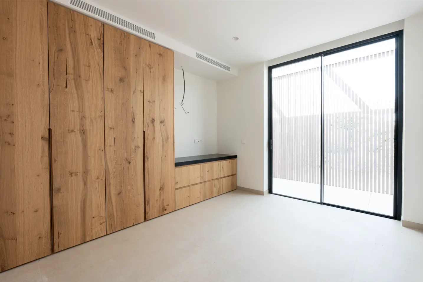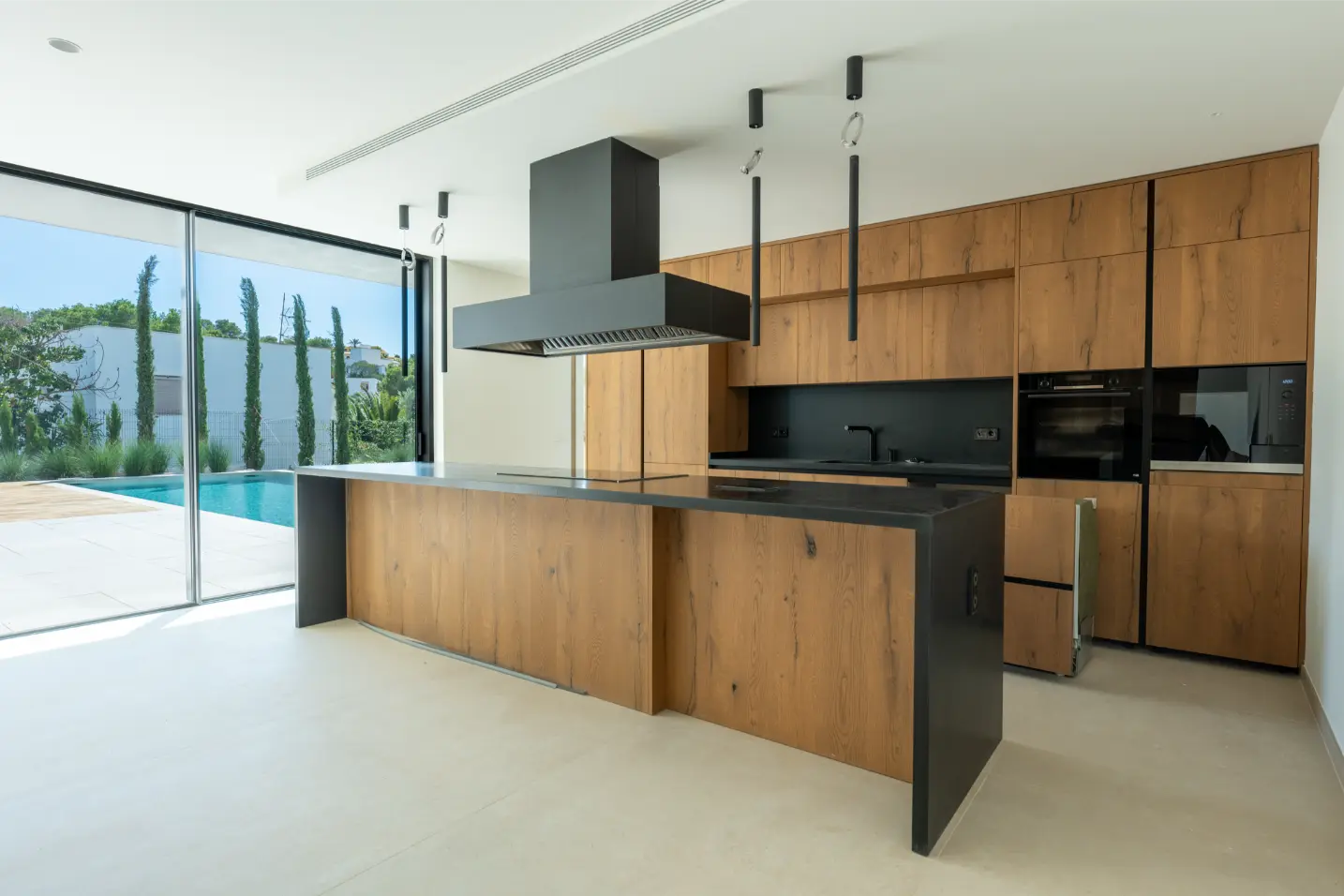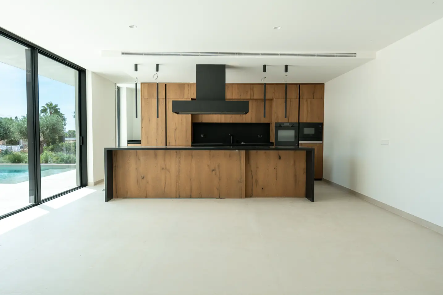 Designed for modern Ibiza living, this villa integrates indoor-outdoor living seamlessly. The ground floor features an expansive living area and open-plan kitchen, which flows effortlessly into the lush garden and private pool area. With floor-to-ceiling glass walls, natural light floods the interior, creating a bright and welcoming atmosphere. This villa is perfect for both relaxation and entertaining, whether you’re hosting guests or enjoying peaceful family time.